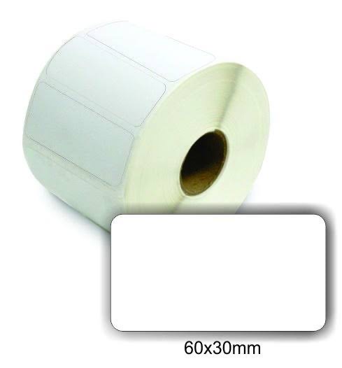 Etiqueta térmica adesiva, rolo com 25 metros cada. Especificações: Indicada para impressão térmica, pão por peso, hortifruti, produtos refrigerados. Formato da etiqueta: 60X30 Número de carreiras: 1 carreira Tipo de Papel: Papel adesivo térmico Gramatura do adesivo: 20g de cola e borracha Cor: branco