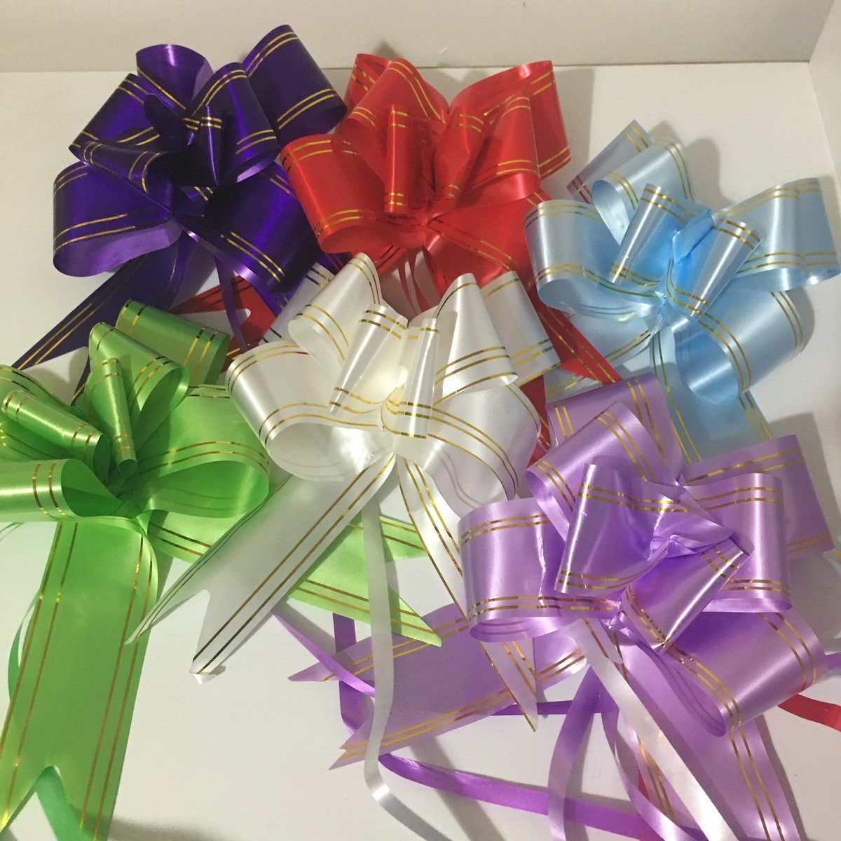 Laços de fita de plástico. Disponível em diversas cores, com filetes dourado nas laterias. Ideal para amarrar e decorar sacolas ou caixas para presentes.